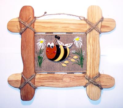 A ceramic figure is featured on hand-painted linen in a wood frame.