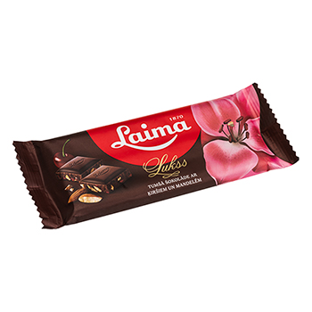 - Dark Chocolate with Cherries and Almonds. Every adorer of dark chocolate will appreciate the new Laima chocolate bar which contains 52% cocoa. The saturated taste of the dark chocolate is enriched by crumbled almonds and freshened by cherry pieces. Everyone will appreciate and enjoy the pleasant combination of flavours.