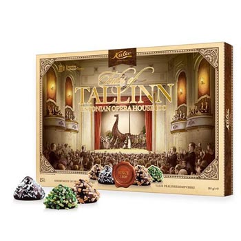 Estonia Teater assortment of praline candies The Estonia Teater (Estonia Theatre) chocolate box contains a delicious selection of classic praline chocolates: almond, hazelnut and coconut praline filling that melts in your mouth, covered by a thick chocolate glaze made of real cocoa butter. The well-balanced bouquet of classic flavours is a treat for many.